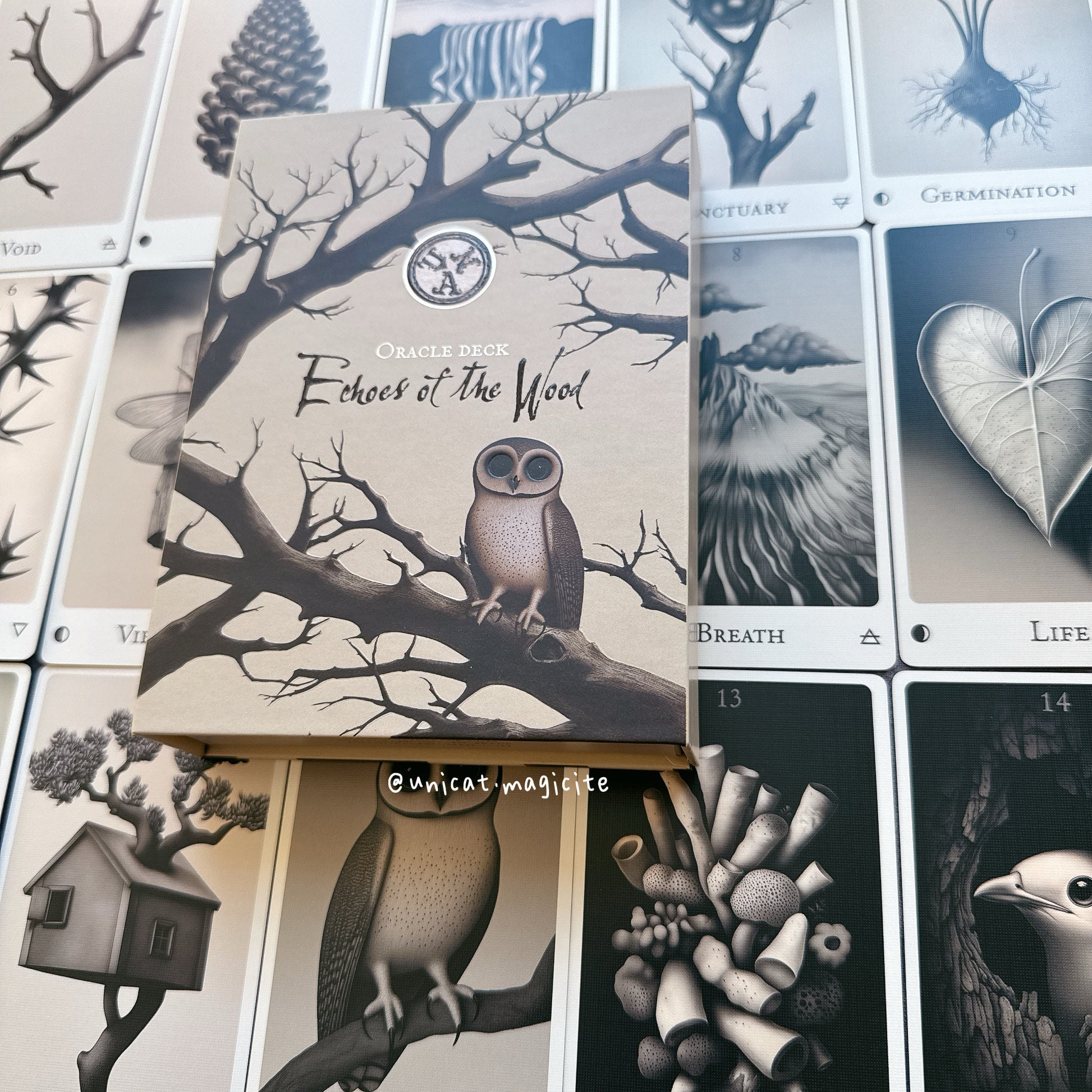 "重生和衰落的循環、對大自然的觀察以及冥想啟發了我創作這副神諭卡。"